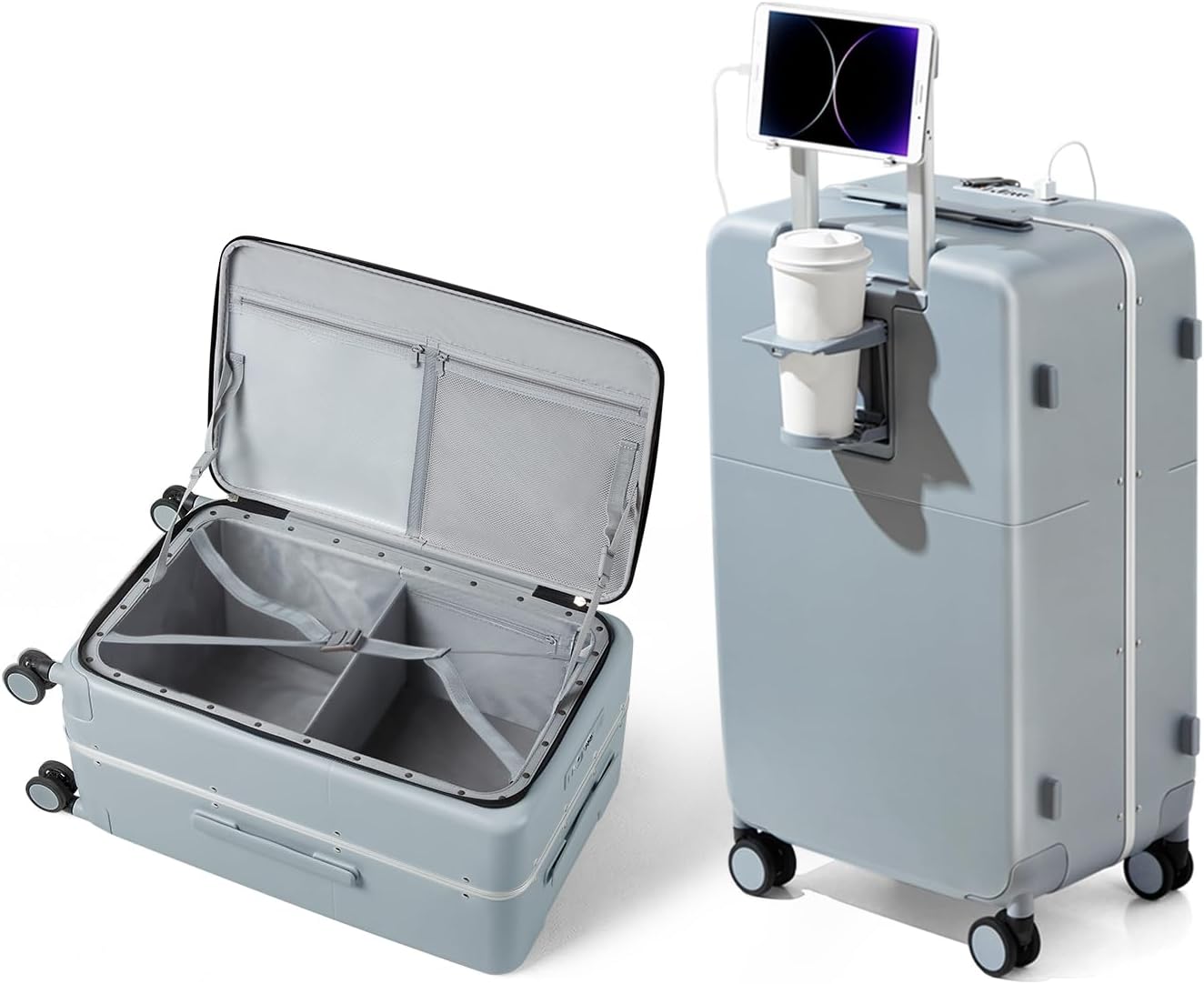 - 【Multifuctional Holder】This luggage feature with cup holper that is convenient to place drinks, water bottle, umbrella, etc,. And amazingly there is a phone holder on the handle and it also be as a hook while traveling to hang your bag, U-shaped pillow.